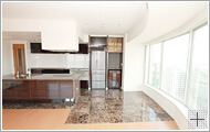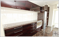 キッチンではリビング・ダイニングとの間にあった間仕切り壁を取り除き、開放的な空間に仕上げました。キッチンカウンターの表面に天然石を用いて、床もコーティング。キッチン背面には吊戸も設置しました。