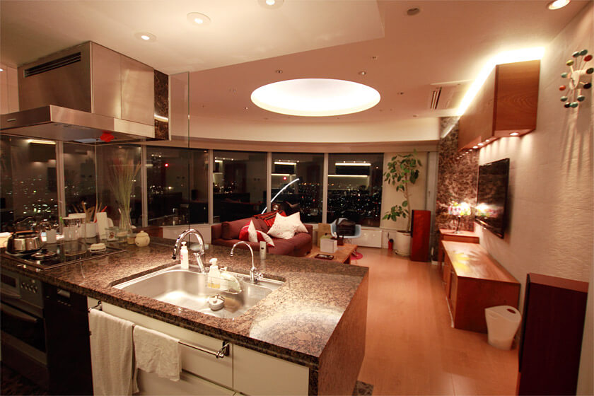 主な施工内容:【リビング・ダイニング】天井折上工事、天井貼替工事、LED間接照明設置工事、間仕切り壁改修工事、天井造作工事、ダウンライト設置工事、床コーティング工事/ 【キッチン】カウンター大理石貼工事、吊戸製作・設置工事/【寝室】壁紙貼替工事、テレビ壁掛け設置工事/【書斎】アクセントウォール貼付工事、テーブルボード制作・設置工事 など