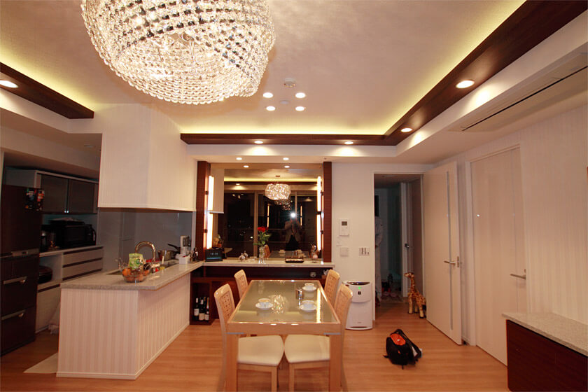 リビング・ダイニングでは、堀上風天井造作工事を行い、ラインLED間接照明も設置しました。また、キッチンカウンターそばには上部がカラーミラーとなっている薄型アクセント家具を設置しました。