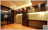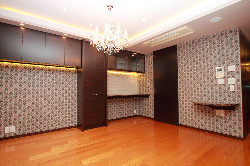 こちらの部屋では、オーダーメイドによる吊戸とワークデスクを製作・設置しました。天井造作工事も行い、造作した箇所にエコカラットを貼り、デザイン性と高めたほか、LED間接照明やシャンデリアの取り付け工事も行いました。また、部屋のドア周りとバルコニー側壁面のみ、あまり華美にならないよう程度にテイストの異なる壁紙に貼替工事を行いました。