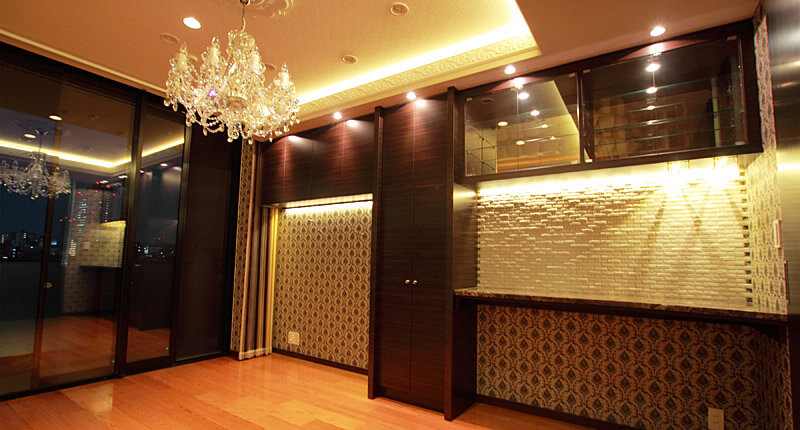 リビング・ダイニングでは、オーダーメイドによるテレビボードを設置するほか、天井造作を施した上でシャンデリアも設置。LED間接照明取付工事やLEDダウンライト新設工事も行い、ライティングにこだわって明るい雰囲気の空間に仕上げました。高級ソファーの代名詞とも言えるスネークソファーを製作・設置するほか、バーカウンタースペースや吊戸を設置して、ブラインドも取り付けました。