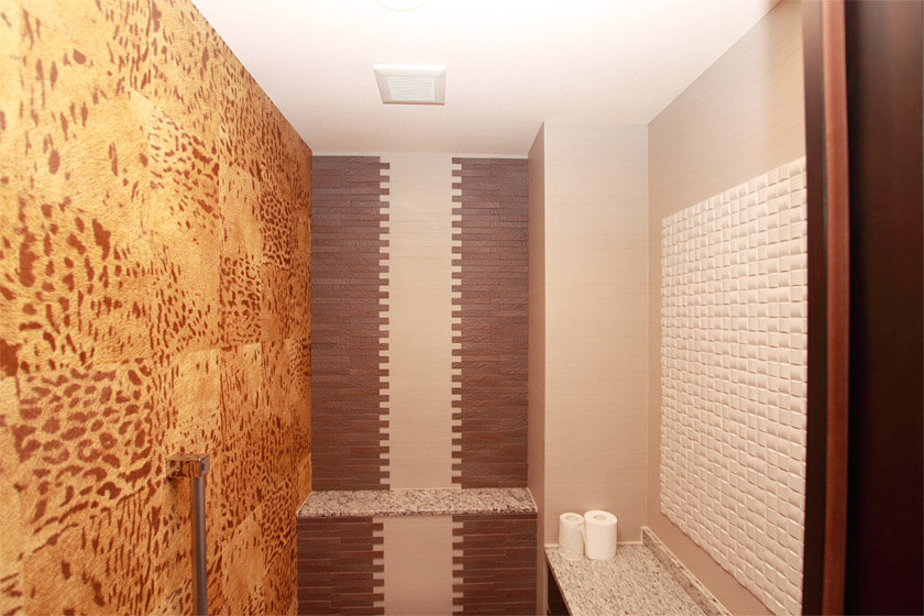 トイレでは、便器や手洗い器はもともとキレイな状態のものが設置されていたため、大きくは改修工事を行わず、壁紙の貼り替え工事を行うなどして、高級感が感じられるように仕上げました。また、トイレ正面とサイドにエコカラットも貼り、調湿機能や消臭効果といった機能性を加える同時に意匠性も高めました。