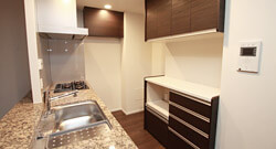 キッチンでは、システムキッチン交換工事を行ったり、キッチンカップボードの新設工事、ダウンライトやキッチンライトといった照明設備の増設・入替工事を行うことが多く、デザイン性の高さと調湿機能と消臭機能をあわせてもった建材「エコカラット」を敷設する工事やキッチンカウンターに大理石を貼る工事も多く行っております。